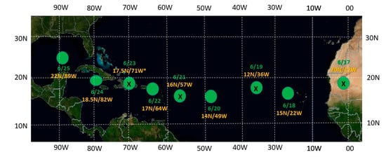 One of the best opportunities in exploiting the thermodynamic characteristics of the “classic SAL” occurred during the period 17–29 June 2020, where satellite, model, and surface-based measurements highlighted very strong SAL signatures throughout its progression. This episode became a noteworthy global media concern, as human impacts from the Saharan dust were considered an exacerbation of the novel coronavirus pandemic, particularly over the greater Caribbean and southern United States populations. The NOAA-20 Visible Infrared Imaging Radiometer Suite (VIIRS) true color imagery (Figure 8) was used to track the dust plume from its source over northwest Africa through the tropical north Atlantic basin. Note the fairly cloud-free region within the associated dust pattern, which is quite unusual this far from the source region. The strength of the SAL is dramatized as far downwind as off the southeast United States coast on 28 June. Figure 9 provides a mapping of the approximate SAL positions for each day. The “X” within each dot are days that have corresponding plots, as displayed in Figure 10. In Figure 10, the profiles for June 21 and 23 are very similar to a typical SAL event, with the temperature (solid red) lines following constant theta, or dry adiabat from 900 hPa to ~650 hPa. Within the same depth, the mixing ratio profile (dashed red line) follows a slightly drier than constant w profile. The mixing ratio line reaches 600 hPa before reaching another dry layer above 500 hPa.