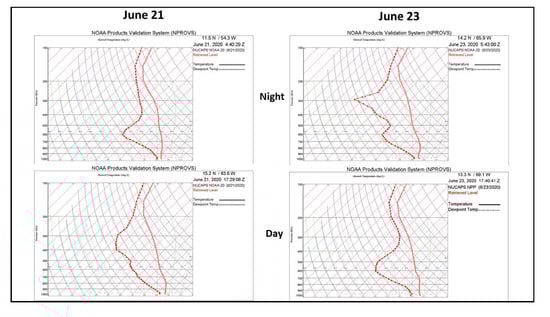 Composites of early morning (night) and afternoon (day) Skew-T plots of temperature (solid lines) and dew point temperature (dashed lines) of the S-NPP and NOAA-20 NUCAPS over the locations mapped in Figure 9 for June 21 and 23.