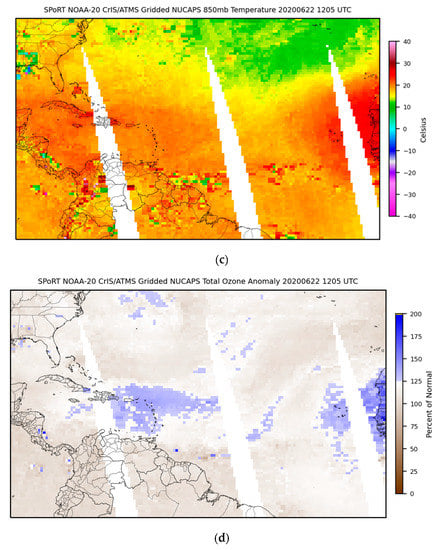 A number of Gridded NUCAPS products, as sampled in Figure 11, depict strong SAL signatures within each of the products. TPW (Figure 11a) and 700–500 hPa LPW (Figure 11b) exhibit lower precipitable water values in the vicinity of the SAL, as seen in the true color imagery (Figure 8). Although not shown, the near-surface LPW (sfc-850 hPa) indicates moist near-surface conditions, consistent with SAL characteristics. Additionally, warm conditions are evident in the 850 hPa temperature (Figure 11c) Gridded NUCAPS field. Fields such as relative humidity and lapse rate can additionally be analyzed to identify the SAL to further assess dry, stable conditions. Even the Gridded NUCAPS ozone anomaly indicates elevated ozone values in the SAL region, consistent with previous literature [,], where elevated ozone mixing ratio values were observed above the SAL. However, additional analysis is needed to determine the efficacy of utilizing the ozone anomaly for SAL identification. As demonstrated here and in other studies [,], the NUCAPS vertical soundings and Gridded NUCAPS present new opportunities to analyze the physical process and characteristics of the SAL as it traverses the data-sparse Atlantic basin.