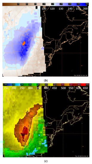 An example of the extratropical transition of Hurricane Arthur in 2014 highlights additional analysis that can increase the situational awareness of changes in the hurricane environment as it relates to anticipating changes in storm intensity. During 4 July, Arthur interacted with an upstream mid-latitude trough and accelerated northeastward. The warm, dry stratospheric air associated with the upper-level trough is colored orange in the air mass composite imagery (Figure 14a; [,,,,]) derived from the Moderate Resolution Imaging Spectroradiometer onboard NASA’s Aqua satellite. Figure 14b shows that the stratospheric air is drawn further into the storm over the next 23 h. According to the National Hurricane Center [], Arthur began to lose strength as the storm encountered strong upper-level winds and colder sea-surface temperatures. Arthur was classified as a tropical storm by 0600 UTC on 5 July and deemed extratropical by 1200 UTC. Figure 14b is 5.5 h after the extratropical classification.
