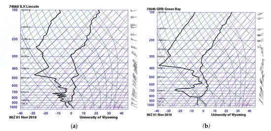 The 1 November 2019, 0000 UTC sounding at (a) Lincoln, Illinois, and (b) Green Bay, Wisconsin. Images retrieved from the University of Wyoming [].