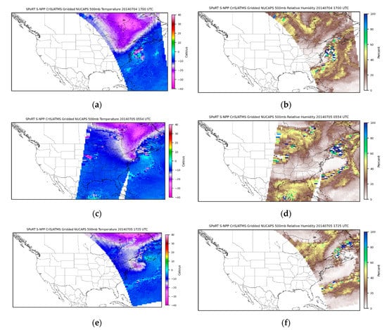 - Zavodsky, B.T.; Smith, N.; Dostalek, J.F.; Stevens, E.; Nelson, K.; Weisz, E.; Berndt, E.B.; Line, W.; Barnet, C.D.; Gambacorta, A.; et al. Development and Evaluation of a Gridded CrIS/ATMS Visualization for Operational Forecasting. In Proceedings of the 2016 AGU Fall Meeting, San Francisco, CA, USA, 12–16 December 2016. IN31A–1734. [Google Scholar]