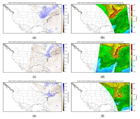 S-NPP Gridded NUCAPS ozone anomaly (left) and tropopause level (right): (a,b) overpass time on the 4 July 1745-1755 UTC; (c,d) combined overpasses on the 5 July with 0605-615 UTC on the right and 0745-0755 UTC on the left; (e,f) valid on the 5 July 2014 1725-1735 UTC.