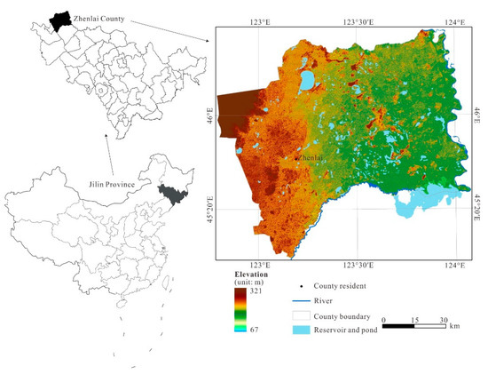 Zhenlai County is located in the north of Baicheng City in Jilin Province, China, with a latitude of 45°28′N to 46°18′N, longitude of 122°47′E to 124°04′E (Figure 1), and a total area of 5316 km2. By 2018, the population was 264,600. The study area is located on the Songnen Plain, the terrain is high in the northwest, flat in the southeast, and low in the southeast, and Zhenlai County is bordered by Nenjiang in the east and by the Taoer River and Yueliang Lake in the south.