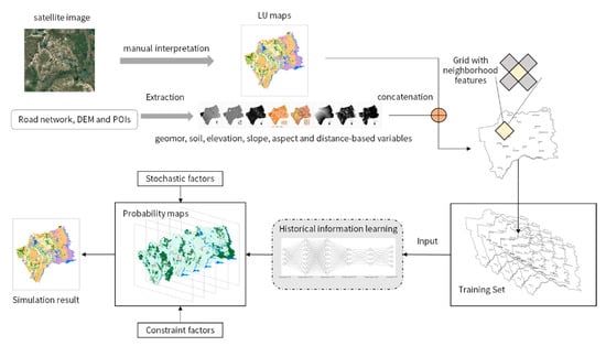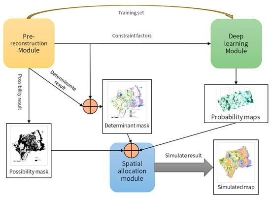 Traditional means and algorithms lack the ability to quantitatively analyze the drivers and mechanisms of LUCC, and the accumulation of massive data over the years provides the possibility of using deep learning models for related explorations. The probability of the LU distribution can be determined by a deep learning model. The LU probability cannot determine whether a certain LU type exists at that time; its function is to determine the distribution probability of a variety of LU types in a spatial unit, and the probability is the basis for the SM.
