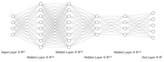 We conducted experiments on LUCC reconstruction in 2013 and 1980, and the overall accuracy rates were 91.2%, 91.8%, 92.3%, 92.1%, and 91.9% in 4–8 layers of neural networks, respectively. In this paper, the 6-layer neural network is adopted. The network structure is as follows (Figure 5): the number of neurons in each of the 6 layers is 40, 256, 256, 128, 128, and 5. The activation function used in this paper is the sigmoid function, which is a continuous and smooth function in the domain of definition, and it is differentiable everywhere. Therefore, the sigmoid function can compress the output value of the network to the interval [0,1], which is convenient for forward transmission. The output is the probability that the grid corresponds to the land use type, and the output of all of the grid units is combined to generate a probability map.