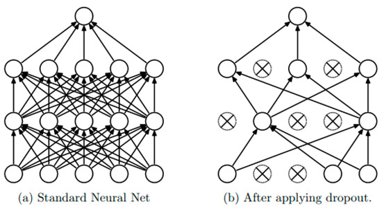 Good performance on the training set, poor performance on the test set, and high variance are a sign of overfitting. To prevent overfitting of the model, the regularization method is used, and the dropout operation is added during the training stage. The neural network model of the dropout is shown in Figure 6. In this paper, the 6th layer dropout rate is 0.1, and for the other layers, it is 0.