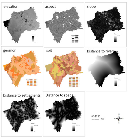 Relevant studies have shown that the most important natural driver that affects the LUCC is the soil, followed by the slope and elevation. Due to the small spatial differences in the climate factors at the county scale, the climate factors were not included as impact factors of LU suitability, and five natural geographic environmental factors, including the soil type, topographic type, elevation, slope, and aspect, as well as the distance to the rivers, were included [21,22]. The step of variable selection is realized in the deep learning iterative process.