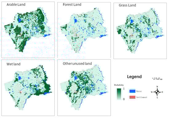 According to the order of arable land, forestland, grassland, wetland, and other unused lands, under the quantitative control determined in the constraint factors and within the scope of the possibility factors, the LU type must be selected according to the positive order in the probability maps.