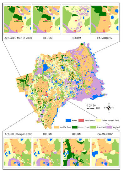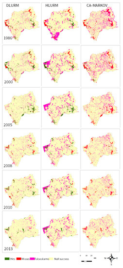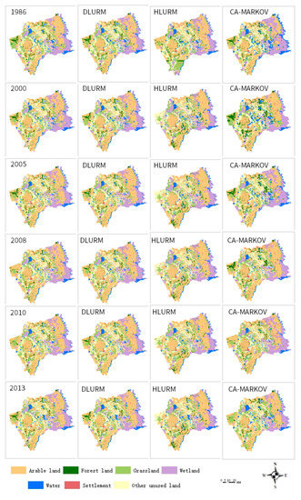 Table 3 lists the reconstruction results using the DLURM, HLURM, and CA-Markov model in the test set (1986, 2000, 2005, 2008, 2010, and 2013).