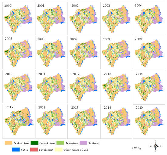 The agricultural development in Zhenlai County is relatively delayed and is in the agro-pastoral transition zone of northern China. The ecological environment is fragile and extremely sensitive to human activities and climate change. Ecological problems, such as soil erosion, land desertification, and salinization occur frequently, severely restricting the sustainable development of the local socioeconomic and ecological environment. The historical process of human activities in the study area is the joint development of animal husbandry and planting from animal husbandry to form an agro-pastoral ecotone in space. From the 1980s to 2010, the arable land has been increasing year by year. Grassland, forestland, and wetland have been decreasing year by year. After 2010, by returning farmland to forestland and wetland, the growth trend of arable land basically stopped. Grassland, forestland, and wetland showed restorative growth. There is a detailed approach to the land use categories in Zhenlai in Table 1 and Table 2.