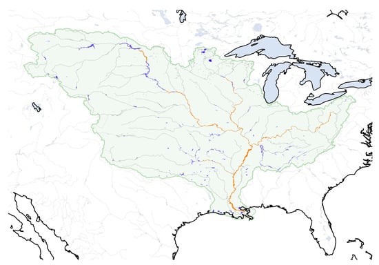 In this work, the Mississippi River Basin (MRB) is used as a case study area. Covering an area of about 3,000,000 km, the MRB is the largest basin in North America and encompasses about 40% of the area of the United States. Moreover, it is the third largest basin in the world after the Amazon and Congo []. It is a region that is densely populated. In 1982, 18 million people relied on the Mississippi for their water supply []. This has resulted in intense anthropogenic water use, due to which many large reservoirs have been built up. The Mississippi, with its tributary the Missouri, is the longest (about 3730 km) and largest (about 16,800 m/s) river in North America.