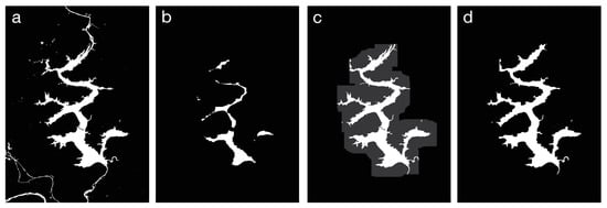 Visualization of the morphological operations used in the automated target detection: (a) initial land–water mask, (b) after erosion, (c) after dilation, (d) final land–water mask.