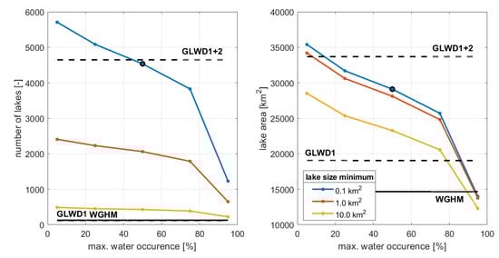 The automated target detection approach described in Section 3 with a water occurrence threshold of 50% identified 4535 water bodies with surface areas of 0.1 to 1291.04 km and a total sum of 29,100.72 km. The mean area is 6.4 km. In total, 2061 lakes/reservoirs were found that are larger than 1 km, 429 that are larger than 10 km and 45 that are larger than 100 km. While the number of detected water bodies was very close to the number given in GLWD (Level 1 and Level 2), which is 4647, the total area is underestimated by almost 4600 km (the area from GLWD is 33,688 km). This changes with the use of different water occurrence incidences (see Section 3.2 for details). The number of water bodies, as well as their surface area, increases if no limitation of water occurrence is used (>5%). In this case, 5708 lakes larger than 0.1 km are identified with a total surface area of 35,397.54 km. Figure 3 shows the numbers for different thresholds of water occurrence probabilities. The blue line represents the results for all water bodies larger than 0.1 km. For the red and orange lines, larger lake size limits of 1 and 10 km are applied. The number and size of detected lakes larger than 10 km for higher water occurrences correspond well with those from GLWD Level 1 and WGHM.
