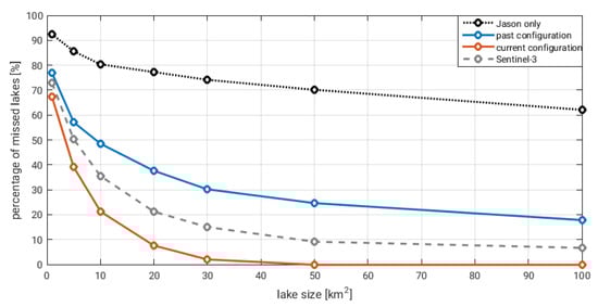 As expected, most of the larger lakes are captured by the altimetry missions. The smaller a lake, the higher the probability that it is missed by the satellites. Figure 4 shows the percentage of missed water bodies for the four different mission scenarios depending on the size of the lakes. With the current configuration, all lakes larger than 50 km and almost 20% of the lakes larger than 10 km are captured. This is a significant improvement with respect to the past configuration of Jason and Envisat, which missed almost 40% of all water bodies larger than 20 km. However, even today, about 67% of all water bodies larger than 1 km are missed in the MRB. This number will only be improved significantly when a wide-swath altimetry mission such as SWOT—planned for 2021 (see Section 5.5)—will become active. When only using Jason, more than 60% of lakes larger than 100 km cannot be monitored, whereas the Sentinel-3 configuration alone performs better than the past configuration of Jason and Envisat.