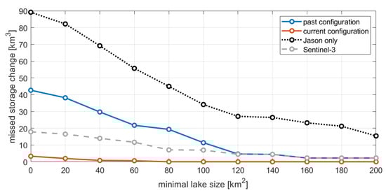 Although WGHM represents only about half of the available water surface area in the MRB (14,671 of 29,101 km defined by the automated target detection), about 300 km (2% of the WGHM total area) still cannot be mapped by satellite altimetry due to the orbit configuration of the missions. The averaged surface area of WGHM targets is 116 km and the mean size of mapped water bodies is 124 km. The percentage of missed water volume changes is in the same order of magnitude: about 2% of WGHM storage changes cannot be monitored by current satellite altimetry. Thus, it is reasonable to say that the current altimetry configuration is able to provide almost the same information to that available from global hydrological models. However, the temporal resolution differs: while WGHM provides monthly values, the altimetry resolution can yield values from a few days to 10 or 35 days, or even fewer, depending on the missions involved (see Section 2.2 and Section 5.4). However, concerning long-term storage changes, approximately 25% are missed by the satellites, even reaching 50% when only Jason missions are used. These numbers improve when only considering larger lakes (see Figure 5). With the current configuration, storage changes of all lakes larger than 80 km can be monitored, whereas Jason still misses about 15 km for lakes larger than 200 km.
