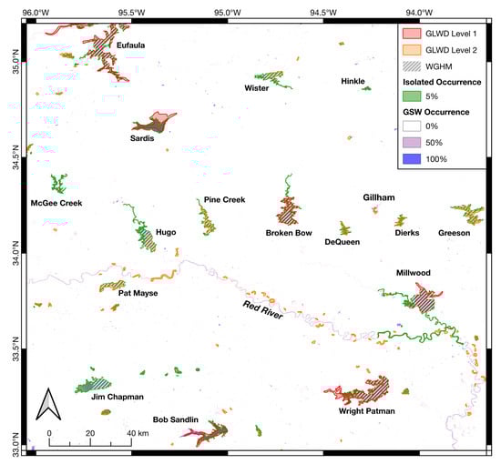 As example, Figure 6 shows an area along the Red River at the border between Arkansas and Oklahoma. Several water bodies identified in this study are not part of GLWD Level 1 or 2, such as the lakes Jim Chapman, McGee Creek, Hinkle and some smaller targets east of the Jim Chapman Lake; however, these are contained in WGHM. However, some water bodies are not identified, even though they are available in GLWD; this could be because they are too small, as with Lake Gillham—i.e., consistently narrower than 630 m—and removed by the morphological operations (Section 3.1), or because they are connected to a river (by water occurrence pixels above 5%) and removed manually (Section 3.3) as they could not be distinguished from the river. Furthermore, the different sizes of some lakes are noteworthy. For example, Lake Hugo and Lake Wister are both much smaller in GLWD than in this study.