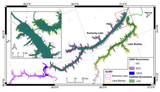 Lake Barkley and Kentucky, separated in the GLWD data (purple and orange) and merged in the isolated results of this study (green). Additionally, the GSW water occurrence is shown as a background. The inset shows the area close to the dams and the Barkley Canal connecting both lakes.