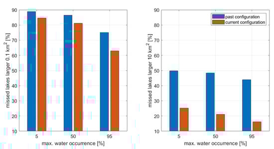 Percentage of missed lakes/reservoirs for different altimetry configurations and different water occurrences. Left: all water bodies larger than 0.1 km; right: water bodies larger than 10 km.