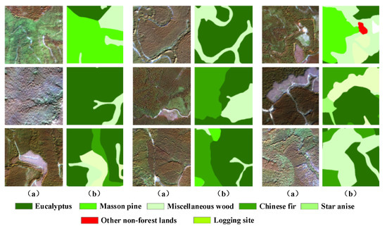 Examples in details for some of the training samples in the GaoFeng forest farm test area (a) Original image blocks; (b) Ground truth (GT) blocks showing the labels corresponding to the image blocks in (a).