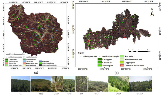 Spatial distribution map of the field survey sample points and some of the training samples in (a) the Wangyedian forest farm; (b) the GaoFeng forest farm test area, (i) Chinese pine, (ii) Larix principis, (iii) White birch and aspen, (iv) Mongolian oak, (v) Korean pine, (vi) Eucalyptus, (vii) Chinese fir, and (viii) Masson pine.