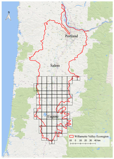 The Willamette Valley is an alluvial region in northwestern Oregon of about 14,457 km2 [26]. It is bounded by the Coast Range to the west and the Cascade Range to the east, encompassing the Columbia River to the north and ending around the Klamath Mountains to the south. The true ecoregion includes a small portion of southwestern Washington, but for the purpose of this research, the northern boundary was clipped to the Oregon-Washington border. The shapefile delineating this region was acquired through the Oregon Spatial Data Library [27]. The southern half of the Willamette Valley level III ecoregion of Oregon, which encompasses the study area [28,29], is approximately 8166 km2.