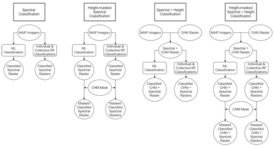 Mirroring the ML method, we performed four RF variations within the non-parametric classification method. The 4-band NAIP and 5-band NAIP + CHM rasters were classified in R, and the CHM binary mask was applied to each of these (Figure 2).