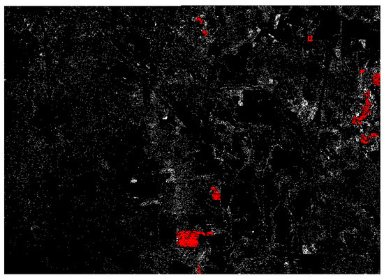 RF individual classification of five-band raster with CHM mask applied. Red areas are contiguous regions of pine class greater than one hectare. White areas are smaller regions of pine class. Black areas are classified as non-pine.