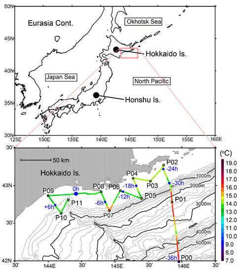 We performed ship surveys from 11 to 13 October 2016 around the Pacific shelf south of Hokkaido, Japan (Figure 1). Along the track of R/V Hokko-maru off the southeastern coast of Hokkaido in the North Pacific, temperatures near the sea surface and geolocations were continuously recorded by a digital thermometer and a global positioning system receiver, respectively, at intervals of 1 min from 13:00 (UTC) on 11 October to 13:00 (UTC) on 13 October 2016. Horizontal current velocities were simultaneously measured by a ship-mounted 150-kHz Acoustic Doppler Current Profiler (ADCP, RD Instruments). The survey started at the southeasternmost point P00 (Figure 1) on the continental slope and proceeded to the north. The ship then moved repeatedly to the southwest and northwest as it crossed thermal fronts on the shelf (Figure 1). Conductivity–temperature–depth (CTD) measurements were conducted along the across-shelf transects of P01–P02, P04–P05, P07–P08, and P09–P10 at intervals of about 2 km. A snapshot SST image of Landsat 8 was obtained when the vessel passed through the position that is indicated by the blue closed circle designated “0 h” in Figure 1. The thermometer temperatures were corrected using a regression line (R2 = 0.997) that related the temperatures of water sampled by bucket from a few dozen centimeters below the sea surface to SST at the CTD stations. The ship speed changed from 0.1 to 16.1 knots during the period of analysis; the mean ship velocity was 7.2 knots. The spatial resolution of the ship-track SST data therefore changed from 3 to 497 m, with an average of 222 m, which is roughly comparable to the order of magnitude of the representative minimum scale of a submesoscale variation (O(0.1–10) km).