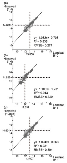We created four linear regression models using two types of datasets from Landsat 8 (Bands 10 and 11) and Himawari 8 (1-h composite and 10-min retrieved skin SSTs) to find the best combination for correcting Landsat 8 data. Figure 2 shows three of the four regression models. The most robust regression model was obtained between the brightness temperatures from Band 10 and 1-h composite skin SSTs from Himawari 8 (Figure 2a). For that model, the coefficient of determination was the largest (R2 = 0.94), and the RMSE was the smallest (0.28 °C). However, the regression line indicated that the brightness temperatures from Band 10 (mean SST = 13.05 °C) underestimated the skin SST from Himawari 8 (mean SST = 14.82 °C). This low-temperature bias relative to Himawari 8 was much more serious for brightness temperatures from Band 11 (mean SST = 11.85 °C) (Figure 2b). These results indicated that the brightness temperatures from the Landsat 8 needed to be corrected to obtain precise skin SSTs.