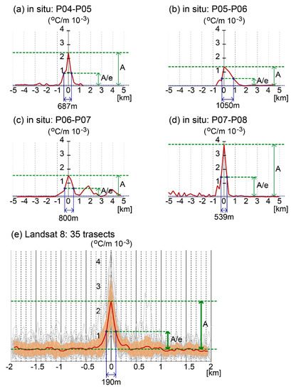Plots showing the horizontal gradient of in situ SST (red line) as a function of distance from the front for transects (a) P04–P05, (b) P05–P06, (c) P06–P07, and (d) P07–P08. The height of the peak in panels (a)–(d) is the difference between the maximum and the baseline of this line, and the quotient of this height divided by e (the base of the natural logarithms) is the e-folding scale, from which the width of the front (blue double-headed arrow) was estimated. (e) Horizontal gradients of skin SSTs from Landsat 8 across 35 transects (see Figure 5). Gray, red, and orange lines indicate horizontal gradients for individual transects, mean, and standard deviation of the 35 transects, respectively.