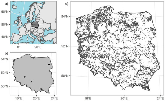 Localization of Poland in Europe (a) with the distribution of the reference forest stands ((b); black polygons) and the distribution of NFI (National Forest Inventory) plots in Poland ((c); black dots).
