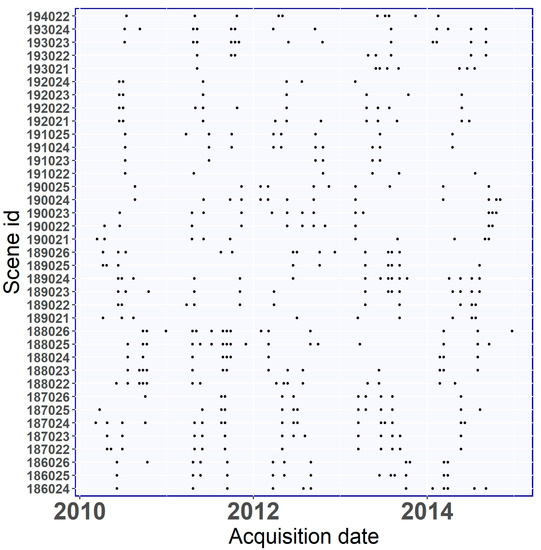 Numbers of the images available for each of the Landsat Scenes (black dots represent the available images).