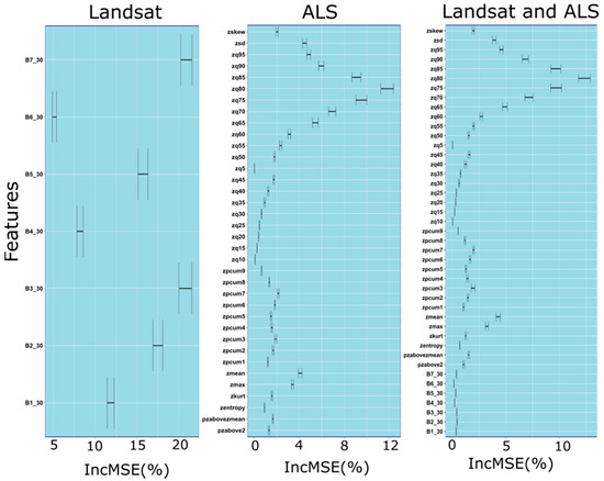 For each set of predictors (i.e., Landsat, ALS and Landsat+ALS), we calculated the variables’ importance rankings using Random Forests and calculating the percentage increase in the mean square error (IncMSE%) by removing all variables one at a time. We calculated the IncMSE% through a 5-fold-cross-validation procedure that associates the relative standard error (MSE) to each variable.