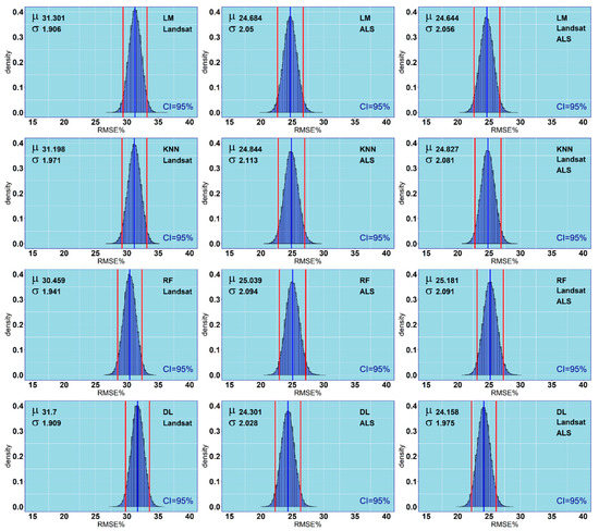 Results of the bootstrapping procedure for each considered approach (LM—multiple linear regression, KNN—k-nearest neighbours, RF—random forests and DL—deep learning) using different sets of predictor variables (Landsat, ALS and Landsat+ALS). The red line identifies the confidence interval.