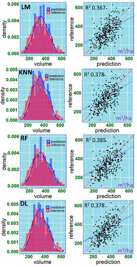 The obtained results showed that there are no considerable differences in accuracy between the evaluated predictive approaches (Table 7, Figure 4 and Figure 5). Generally, the DL method provided the lowest RMSE and bias; however, the differences between models were minimal. Larger differences between the predictive models were observed when validating within groups of dominant tree species. The results show that multiple linear regression (LM) can provide satisfactory results but there are no or only small, benefits from using more advanced methods, including machine learning (KNN and RF) or deep learning (DL). The linear model was used by Nilsson et al. [17] for country-level forest variables estimation in Sweden. The RMSE of 24.69% obtained in our study (LM) regardless of tress species is larger than that obtained by Nilsson et al. ([17]; RMSE: 17.2%–22.0%); however, this might be related to the higher species and structural variability of Polish forests. Parametric and nonparametric methods each have their own pros and cons. Previous works [9,48] pointed to the undoubted advantage of classic multiple linear regression, highlighting the ease of interpreting the model. The advantage of LM is also its ability to extrapolate extreme values. The construction of such models, however, requires more experience and more work for the selection of appropriate predictors. This problem disappears with the nonparametric methods of KNN, RF and DL used in this paper. These models can also provide good performance in the case of non-linear relationships between variables. However, the possibility of more frequent model overfitting and poor results in the case of overly small observation sets are potential disadvantages of these approaches [49,50].
