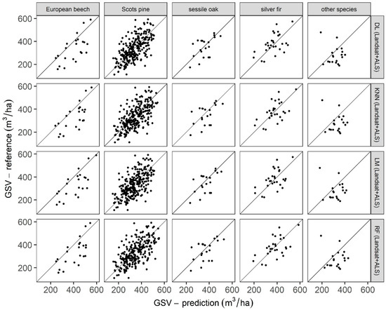 Observed vs. predicted values of GSV (growing stock volume) for validation stands obtained with the best set of predictors (Landsat+ALS) and grouped by dominant tree species and predictive approach (DL—deep learning, KNN—k-nearest neighbours, LM—multiple linear regression and RF—random forests).
