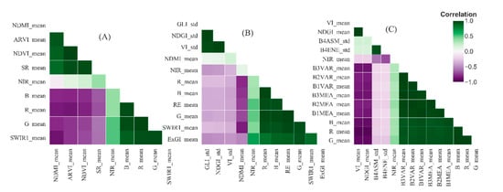 Intercorrelation among independent variables derived from (A) L8, (B) S2, and (C) PS images. See Table 4 for the descriptions of the notations used to represent the independent variables.
