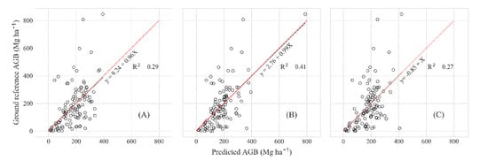 Relationship of ground reference versus predicted AGB using selected models of (A) L8, (B) S2, and (C) PS data. The dashed red and grey solid lines (overlapping) represent the identity (1:1) and the correlation functions, respectively.