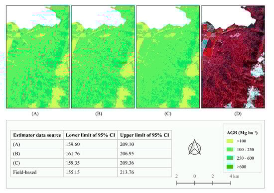 Visual representation of a portion of the predicted AGB using the selected models of (A) L8, (B) S2, (C) PS and (D) false-color composite (NIR-R-G in the R-G-B channels) of the S2 image of the study area acquired on 14 January 2019. The 95% CI for the mean AGB estimates of the respective model predictions for the population are shown in the table.