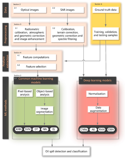 Monitoring and detection of oil slicks is a crucial part of contingency planning for oil spills. Precise detection of oil spills and prediction of their trajectories are beneficial to fisheries, wildlife, liability dispute resolutions, and resource management for monitoring and conserving the marine ecosystem [6]. Traditional oil spill monitoring techniques, such as aerial or field investigation, are costly and fail to achieve timely and efficient identification of oil spill areas. Given the wide coverage, synoptic views, and the frequency of acquiring multisensory data, satellite-based remote sensing (RS) has been extensively used in detecting and monitoring oil spills in the past few decades using various types of remotely sensed data (Section 2). Numerous review papers that focus on oil spill RS are available in the literature [13,14,15,16,17,18]. These studies discussed the utilization and advantages of using various sources of remotely sensed data and techniques for oil spill extraction. However, existing review studies have yet to address the adoption of state-of-the-art machine learning (ML) techniques for identifying oil spills/slicks. The synergetic use of RS technologies and ML algorithms to detect and monitor oil spill slicks has been examined and adopted in a wide spectrum of studies [19,20,21,22,23,24,25,26,27]. ML techniques have demonstrated an effective means to extract oil spills from remotely sensed data in a (semi)automatic manner. Massive amounts of data can be handled and integrated to enable timely decision making and the analysis of potential oil spill incidents. Recent related literature (2010–2020) on the recognition, identification, and detection of oil spills using remotely sensed data and ML algorithms is reviewed in this study. A review of 110 investigations on different components of ML classification systems for oil spill detection, including 79 journal papers, 29 conference papers, and 2 book chapters, was conducted in this study. First, the advantages and shortcomings of commonly used remote sensors in oil spill detection are highlighted. Second, the preprocessing chain of remotely sensed data for oil spill detection and commonly extracted and selected features for oil spill detection are presented. Various classical and advanced ML approaches for oil spill detection are summarized and analyzed. Finally, the challenges, considerations, and future trends of oil spill systems are emphasized. Figure 1 shows the overall structure of developing and adopting ML models for oil spill detection. The remainder of this paper is organized as follows. Different sources of remotely sensed data are described in Section 2. Different stages of data preprocessing are discussed in Section 3. Feature extraction and selection are highlighted in Section 4. Classical and advanced ML techniques for identifying oil spills are analyzed in Section 5. Finally, conclusions are drawn and some considerations for improving oil spill detection are provided in Section 6.