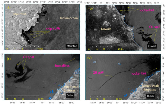 Oil spill incidents recognized from microwave Sentinel-1 images: (a) ship spills near the coast of Mauritius on 10 August 2020, (b) massive oil slick off the coast of Kuwait on 10 August 2017, (c) large oil spills detected on the Arabian Gulf on 8 March 2017, and (d) extended oil spill near the coast of United Arab Emirates on 10 October 2017.
