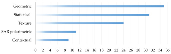 Feature extraction, a critical stage in oil spill detection systems, allows the extraction and input of a set of features to distinguish oil spills from lookalikes (natural phenomena, such as algae bloom, biogenic slicks, currents, and low-wind areas) and other targets on the water. The incorporation of features with reliable discriminatory power contributes to the improvement of classification accuracy in oil spill detection. Various studies have attempted to determine the optimal combination of different features for detecting and classifying oil spills [110,145,177,178,179,180,181]. However, the lack of systematic research on the extraction and combination of various sets of features (i.e., SAR polarimetric, textural, geometrical, and other features) and their influence on classification accuracies has generally contributed to the arbitrary selection of features as inputs to numerous classification systems [177,180]. The majority of reviewed studies explored the extraction of multiple features to detect oil spills from SAR and optical images in the last decade. The following section describes the widely used handcrafted (shallow) features in oil spill detection, while the automatic extraction of deep features is discussed in Section 5.2.