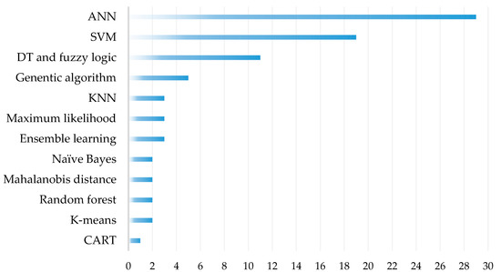 The general framework of oil spill detection comprises the following four main steps: preprocessing of remotely sensed data, image segmentation for dark-spot identification, extraction of discriminative features, and classification of image pixels/objects to discriminate between oil spills and lookalikes. Sufficient and high-quality representative training samples and selected feature subsets demonstrated in Section 4.2 are used as inputs for developing classification models. ML models are developed to solve complex classification problems through recursive and iterative analysis of candidate solutions from given training samples and features without explicitly being programmed to do the task [233]. Various classification algorithms, such as artificial neural network (ANN) [50,52,141,146,163,199,207], SVM [145,180], decision tree (DT) [177], K-nearest neighbor [48,64], genetic algorithm [123,127,130], random forest (RF) [26], fuzzy logic [109,135,136,138], maximum likelihood [234], linear discriminant analysis [114,194], k-means [119], Mahalanobis distance [113], naïve Bayes [110], ensemble learning [46,115], Classification and Regression Trees (CART) [132], and others [38,51,140,142,235,236], have been used to classify oil spills and lookalikes. Widely used traditional ML classification model for oil detection from optical and SAR images are listed in Table 4. Figure 5 shows the frequency of common traditional ML algorithms in oil spill studies (a total of 79 studies). The following subsections provide a brief description of widely used traditional ML models in oil spill classification systems.
