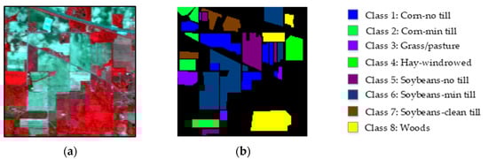 The Airborne Visible/Infrared Imaging Spectrometer (AVIRIS) Indian Pines scene: (a) false-color composite image and (b) reference map.