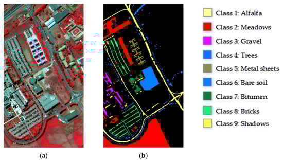 The second data are of the University of Pavia scene collected by the Reflective Optics Spectrographic Imaging System (ROSIS) over a downtown area near the University of Pavia in Italy, with a spatial resolution of 1.3 m. After removing 12 bands with high noise and water absorption, the scene has 103 spectral bands ranging from 0.43 to 0.86 μm, with pixels. Nine ground-truth classes with a total of 42,776 labeled samples are contained in the reference data. Figure 3a,b shows the false-color composite image and the reference map of this scene, respectively.