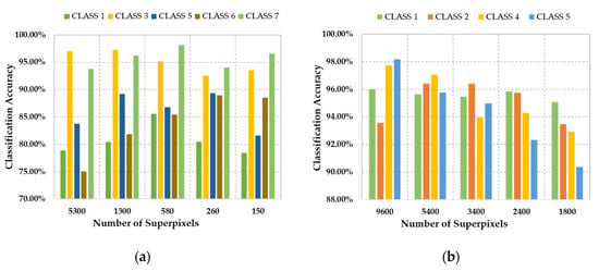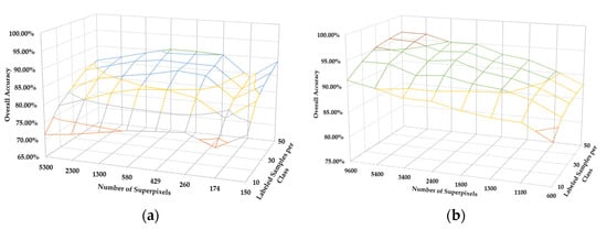 In addition, the number of superpixels in SPCR and MSPCR classifier is decided by the segmentation scale and the number of the pixels via . The corresponding experimental analysis about and the classification accuracy is illustrated in Figure 5 and Figure 6. We can infer the relationship between the segmentation scale and the classification accuracy, which is equal to the relationship of and the classification results. Firstly, Figure 5 shows the impact of the number of superpixels on the classification accuracy (50 samples per class). We mainly select five and four classes to display from the AVIRIS Indian Pines dataset and HYDICE Washington, DC, National Mall dataset, respectively. As illustrated in Figure 5a, the result indicates that the optimal segmentation scale is various for different classes. For example, the optimal segmentation scale of the class 2 is distinct from the other three classes in Figure 5b. In addition, the relationship of the number of superpixels, overall accuracy and the number of the labeled samples is shown in Figure 6. Generally, the overall accuracy increased with the number of labeled samples at each segmentation scale. It is notable that under different number of labeled samples, the segmentation scale is various in order to achieve the highest classification accuracy. Like the most OBIC frameworks, the proposed SPCR method also needs to set the optimal segmentation scale, while the improved MSPCR method can overcome this drawback through taking fusion the spatial–spectral characteristics of HSI at different segmentation scales.
