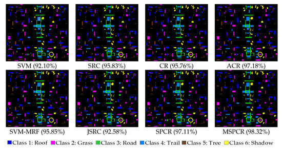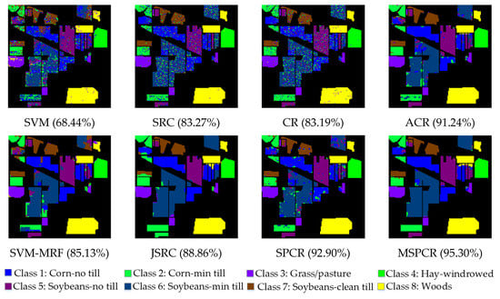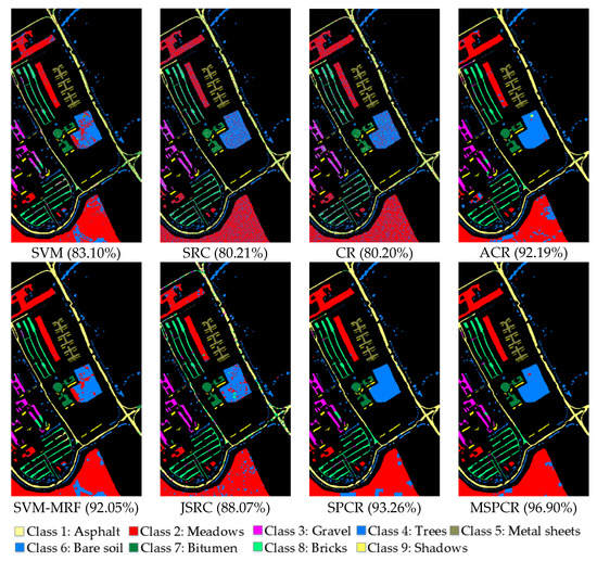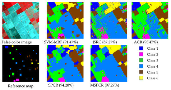 In general, the proposed MSPCR obtains an overall accuracy of 95.30%, which is 2.40% and 4.06% higher than SPCR and ACR, and also 12.11% higher than CR, respectively. For individual class accuracy, it provides great results, especially for the classes 2, 6, and 7. The classification maps in Figure 7 verify the improvement achieved by the MSPCR.