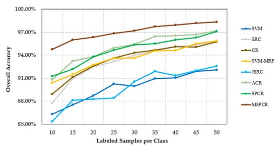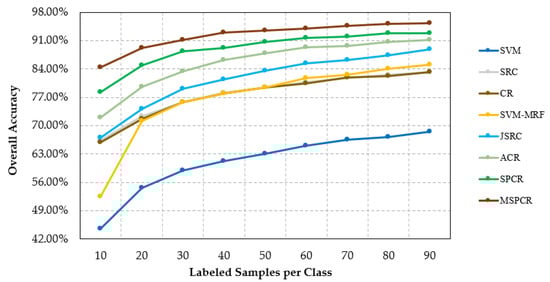 In our second test with the HYDICE Washington, DC, National Mall scene, we evaluated the classification performance of our proposed methods from the spectral–spatial domain with different numbers of training samples. As shown in Figure 12, the classification result shows a rising tendency with the increase of the number of training samples, and curve tends to be flat when the number of training samples reaches to a certain amount. Firstly, the SRC and CR gain a better classification results toward SVM with the increase of the number of the labeled samples in the spectral domain. Though JSRC obtains relatively poor results than SRC, the SVM-MRF, ACR, and SPCR still provide competitive classification performances toward the SVM and CR with the increase of the number of training samples, which proves the integration of the spectral feature discrimination and spatial coherence is a reliable processing framework for the HSIC in most cases. On the other hand, improvement also appeared by the combination of the PD-driven and spatial constraint, which is indicated by the performance of ACR and SPCR-based method versus SVM-MRF and JSRC. In the spectral–spatial domain for all cases, the proposed MSPCR yields the best overall accuracy in comparison with the other related methods, and makes a significant improvement in comparison to the proposed SPCR.