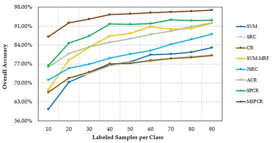 Our second test of the ROSIS University of Pavia scene measured the proposed SPCR and MSPCR with various sizes of labeled samples (from 10 to 90 samples per class). Figure 10 shows the overall classification accuracies obtained by different testing methods, under different number of training samples. With the number of the labeled sample increased, most of measured methods have an increase trend in accuracy. In comparison to the overall classification accuracy of SVM, the SRC and CR firstly have better performances, then perform worse as the number of the labeled samples increased. Considering the correlation of ground object, the classification performance of ACR and SVM-MRF, achieved significant improvements with the increase of the number of samples, with a higher classification accuracy than the JSRC in most cases. In addition, the combination of the PD-decision mechanism and the superpixel segmentation algorithm brings reliable and stable improvement, which can be confirmed by the overall classification accuracies obtained by SPCR method in all cases. From Figure 10, MSPCR method achieves the best classification result among these compared methods, as a result of applying the decision fusion which alleviates the challenge of adapting the fixed single segmentation scale to the spatial characteristic of all categories in the image.